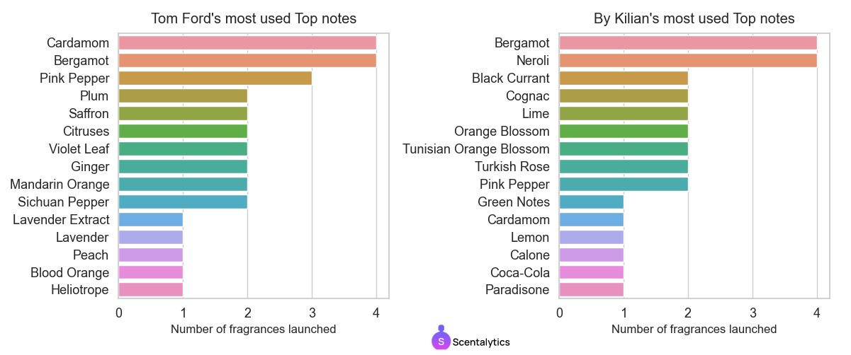 Bergamot is one of the most common top notes in scents of both brands, but with a different companion. In the case of Kilian Paris, this is neroli, while Tom Ford likes cardamom more. Here we can also see how this subtle, but important difference influences the rations of fragrance types and perceived genders discussed above.